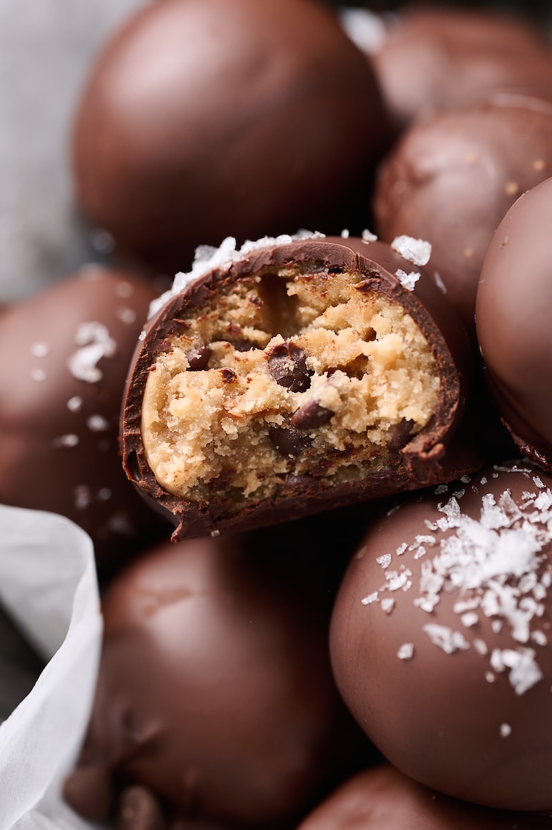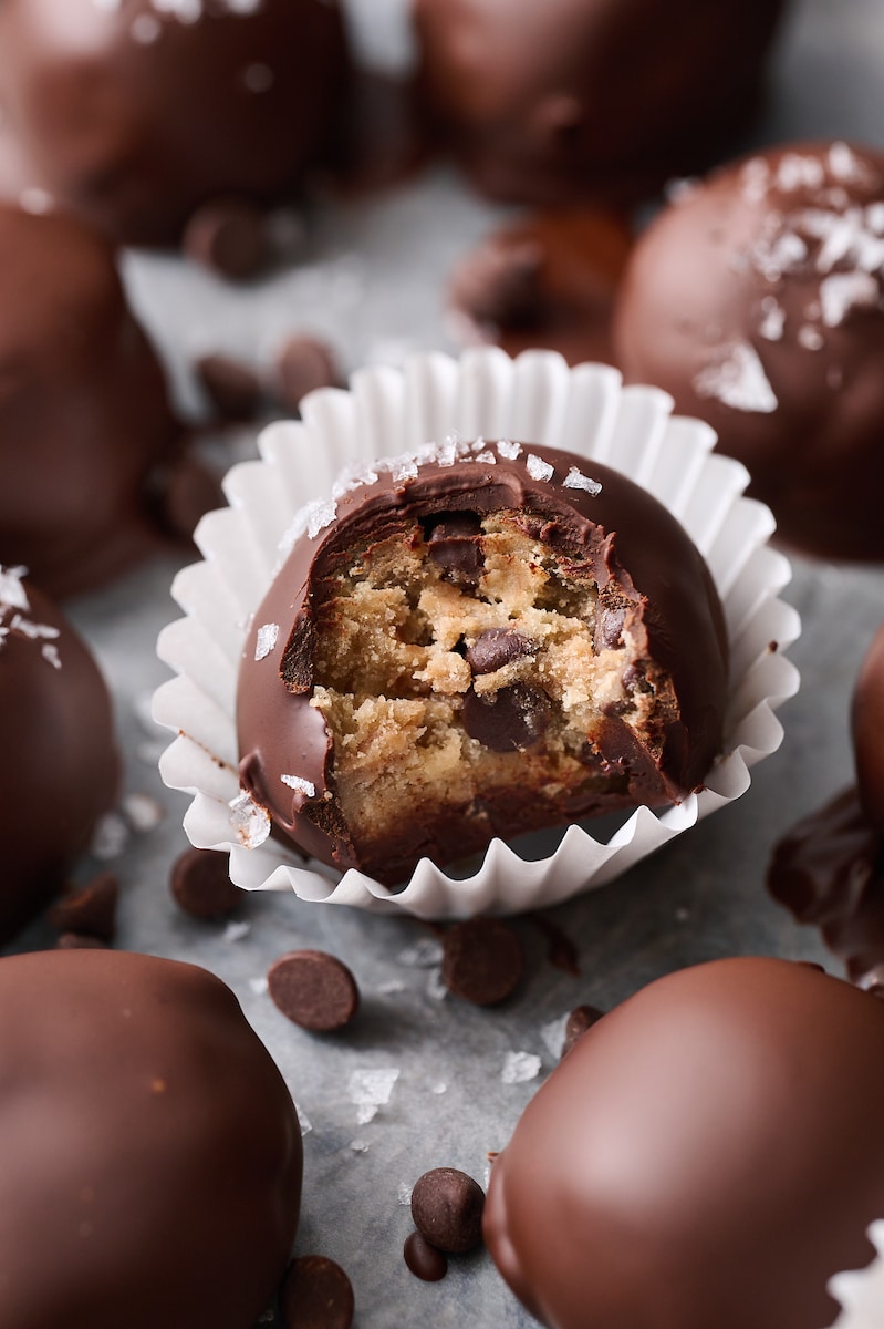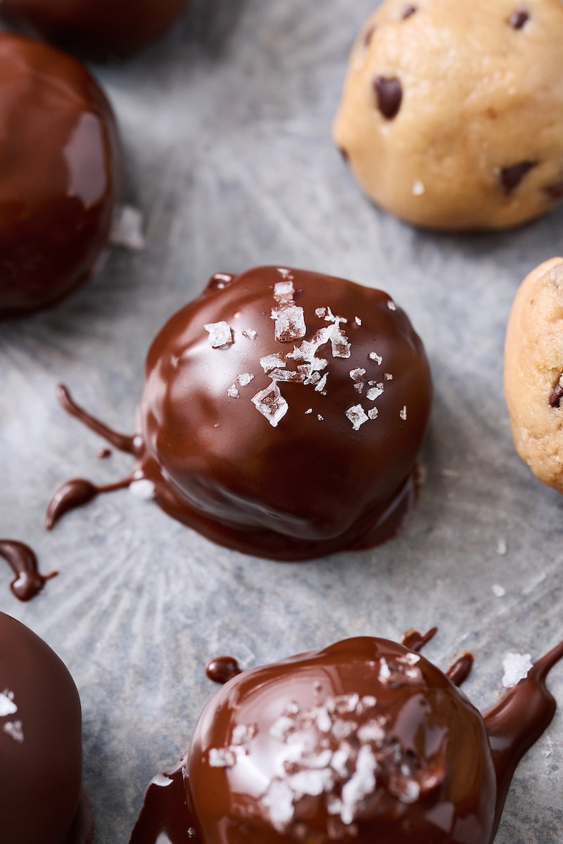 The edible cookie dough is inspired by my internet famous vegan chocolate chip cookies! The main difference? No baking soda and mini chocolate chips! Other than that, the dough recipe is almost identical! The dough is scooped out, rolled into tiny balls, and dipped in a melted chocolate coating that hardens into a deliciously crunchy shell. I like to sprinkle the wet chocolate with a little sea salt, but this is totally optional!