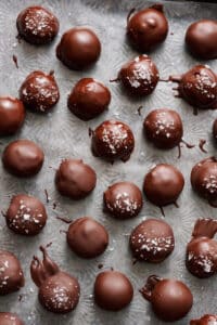- When the truffles are ready to be dipped, place one onto a fork or candy dipper, and dip it into the melting chocolate, letting it completely submerge before pulling it back up. Allow excess chocolate to drip back into the bowl then transfer it back on the parchment lined sheet. Sprinkle with sea salt, if desired. Repeat with all truffles