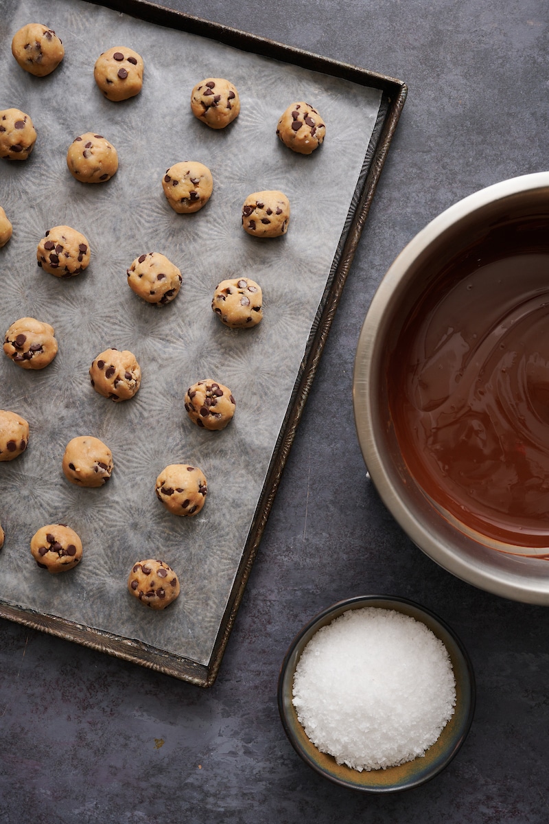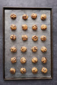 - Using a small cookie scoop, scoop out level balls of the dough and roll it into tight balls. Place the dough balls about an inch apart on the prepared baking sheet and transfer them to the freezer to firm up for at least 30 minutes, or up to 2 hours.