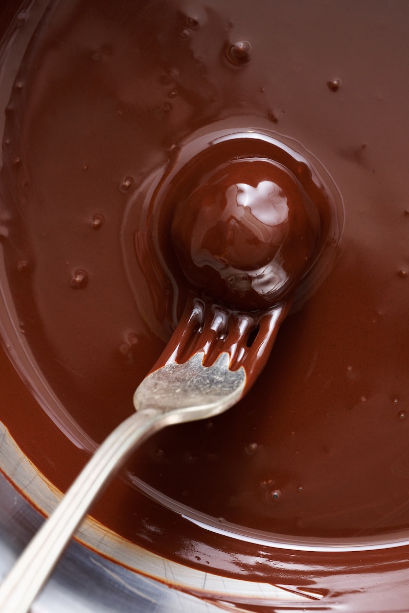 - Dip! You’ll melt the chocolate and coconut oil and mix well, then dip each truffle into the melted mixture! The easiest way to do this is to place one truffle on to a fork or candy dipper, and dip it into the melting chocolate, letting it completely submerge before pulling it back up, and allow excess chocolate to drip back into the bowl before transferring it back on the prepared baking sheet.