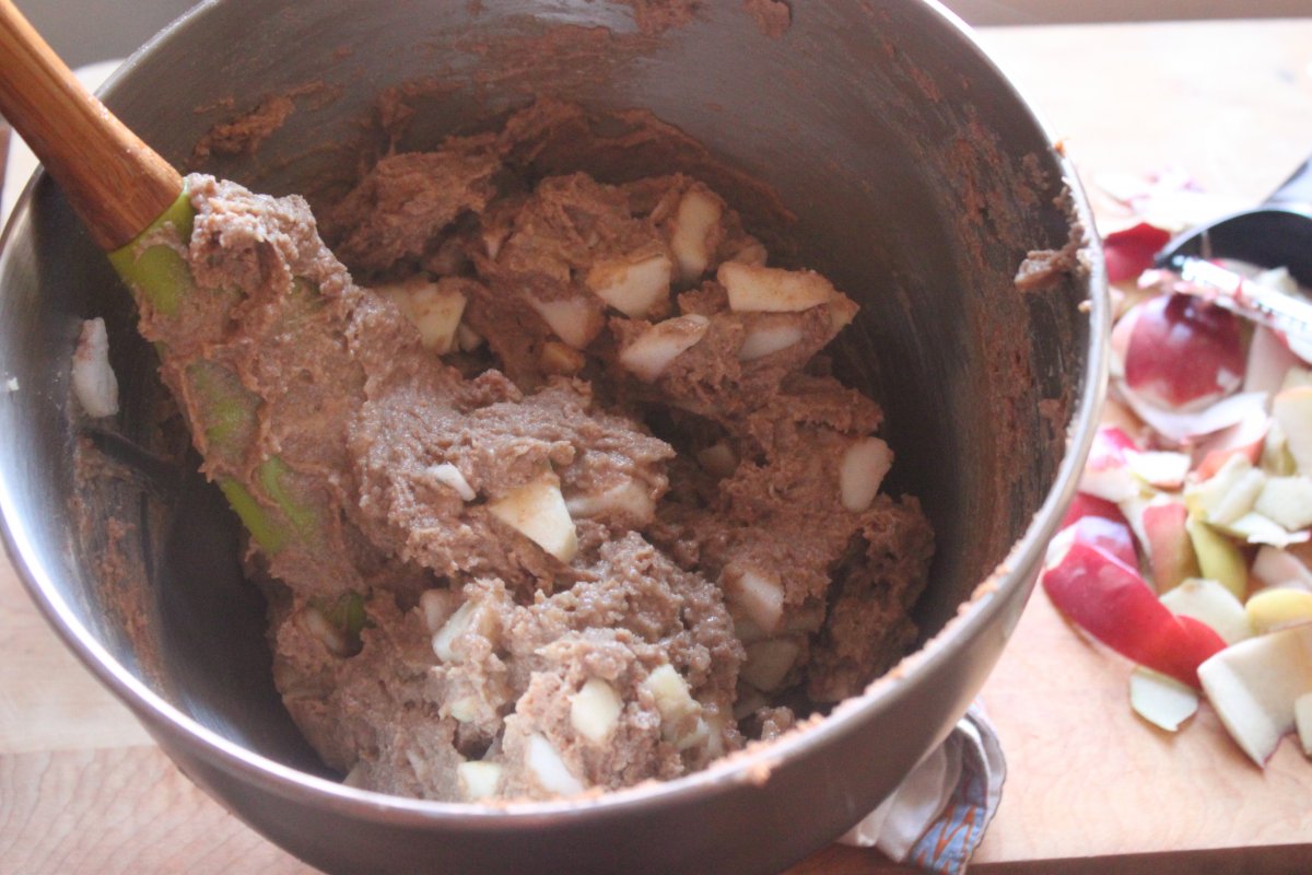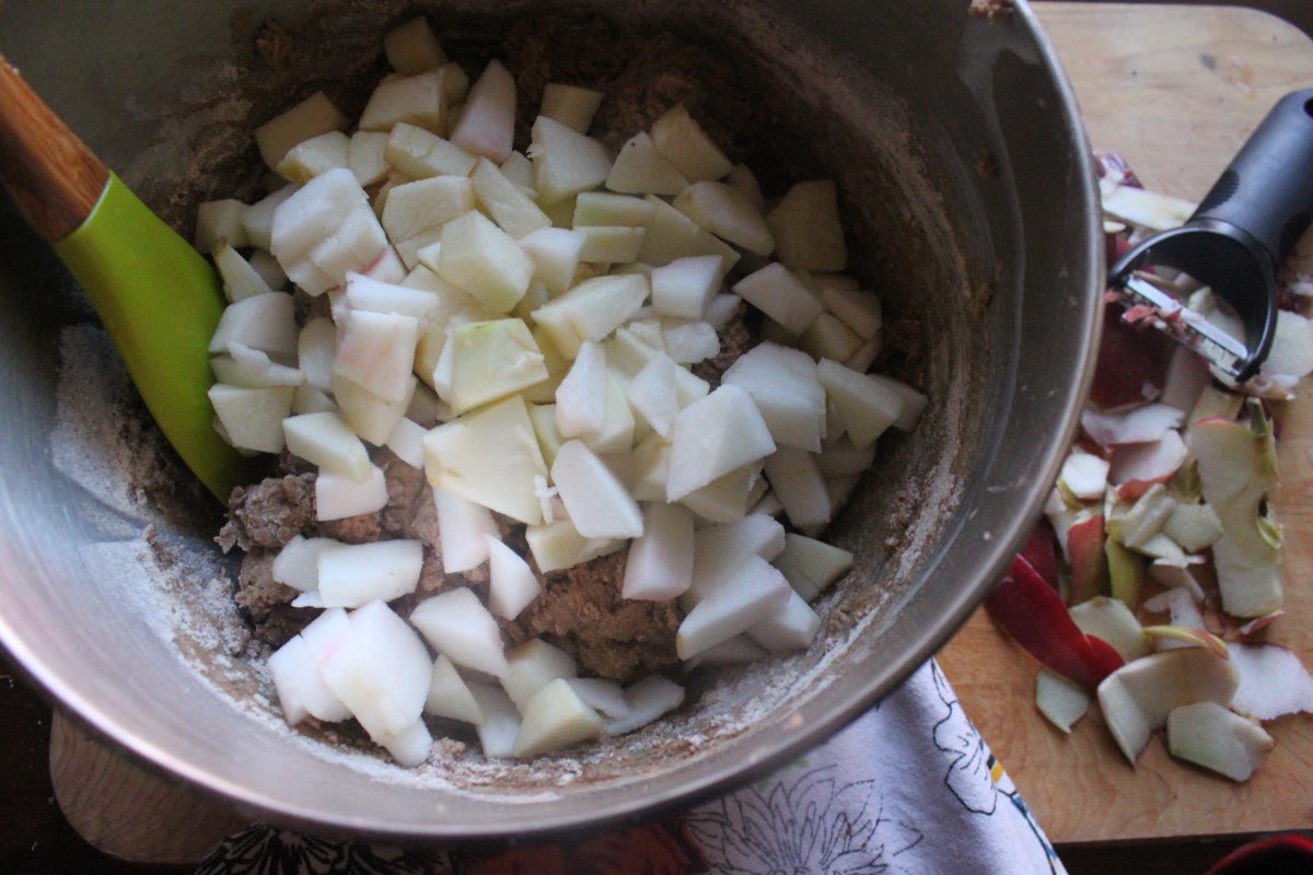 Mix together the flours, baking powder, baking soda, salt, and cinnamon, and set aside. In a separate bowl, cream the butter and add the granulated sugar and 1/4 cup of the brown sugar. Beat until fluffy. Add the egg and mix well; stop once to scrape the sides and bottom of the bowl.Mix in the buttermilk gently. (If you over-mix, the buttermilk will cause the mixture to curdle.) Stir in the dry ingredients and fold in the apple chunks.