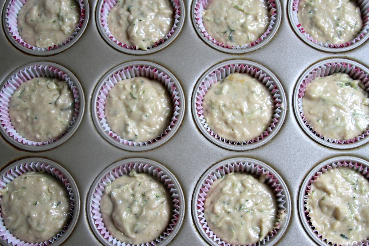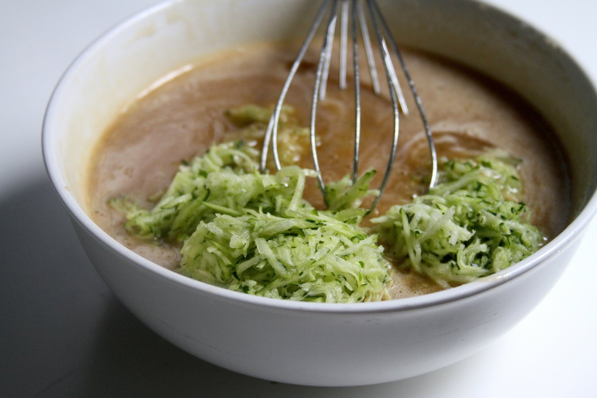 Gently add the dry mixture into the wet one, mixing until almost all of the flour has disappeared. Fold in grated zucchini.