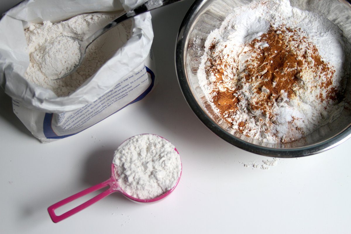 The dry ingredients are your basics plus a hefty dose of cinnamon and a touch of ginger, cloves and nutmeg. Just a touch! The spices give the batter a little extra oomph, but we don’t want to over do it, ya know.